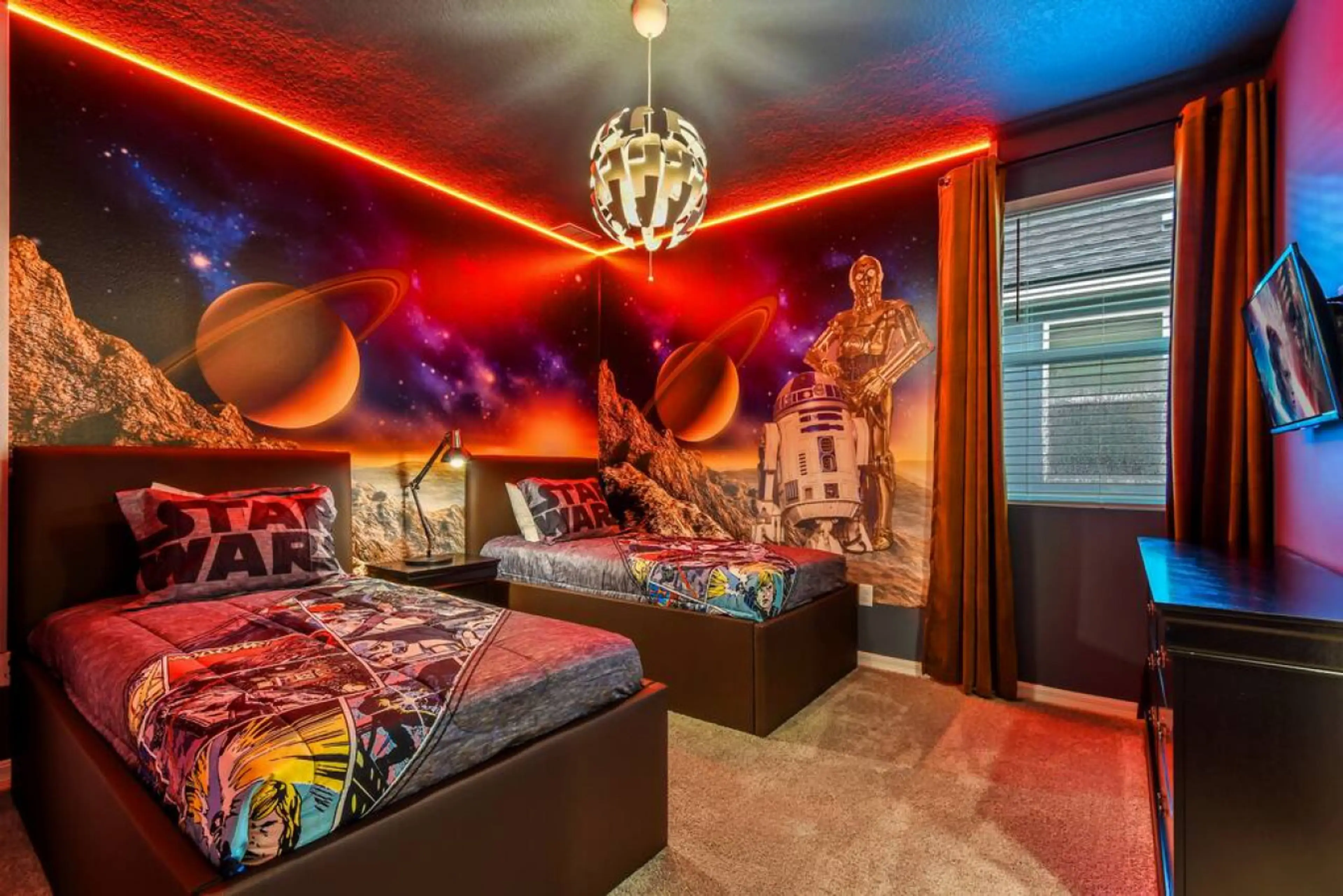 The house was perfect for our big group. Each couple or family had their own bedroom and bathroom which made it nice. Tons of space in the main areas to accommodate our group of 12. Loved having the game room, pool table, extra tv room on 2nd floor, pool and hot tub - something for everyone to do on the days we werent at the parks. Location from Disney was pretty easy trip but was a bit far from Universal parks. Mileage wise not bad but traffic was horrible so each trip there and back took 45-60 minutes each way depending upon time of day. We would stay here again and would recommend this for big groups looking for nice accommodations that don’t break the bank.